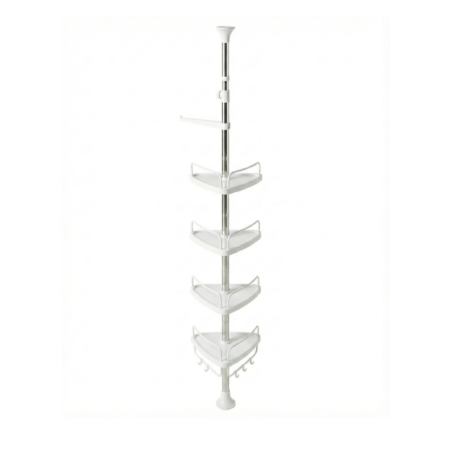Este organizador esquinero de 4 niveles de Kennedy Home Colección en color blanco es una solución vertical telescópica diseñada para maximizar el espacio en duchas, baños o lavanderías sin necesidad de perforaciones. Fabricado con una resistente combinación de acero inoxidable y plástico ABS, este accesorio soporta hasta 5 kg de carga, ofreciendo una estructura estable y duradera frente a la humedad. Cuenta con cuatro estantes ajustables, ganchos laterales y un toallero integrado, ideales para mantener productos de higiene y accesorios siempre al alcance. Su diseño desmontable y de fácil instalación lo convierte en un aliado práctico y moderno para optimizar esquinas de forma eficiente, aportando orden y un estilo contemporáneo al hogar.