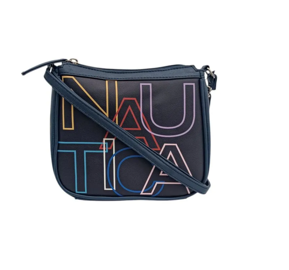 Bolso cruzado: color azul; marca nautica: este elegante bolso de náutica es la elección perfecta para quienes buscan funcionalidad y estilo. Confeccionado en 100% poliuretano con acabado azul marino, es ideal para looks casuales y urbanos. su diseño destaca por el logotipo "nautica" en letras grandes y tonos vibrantes, aportando un aire juvenil y moderno.