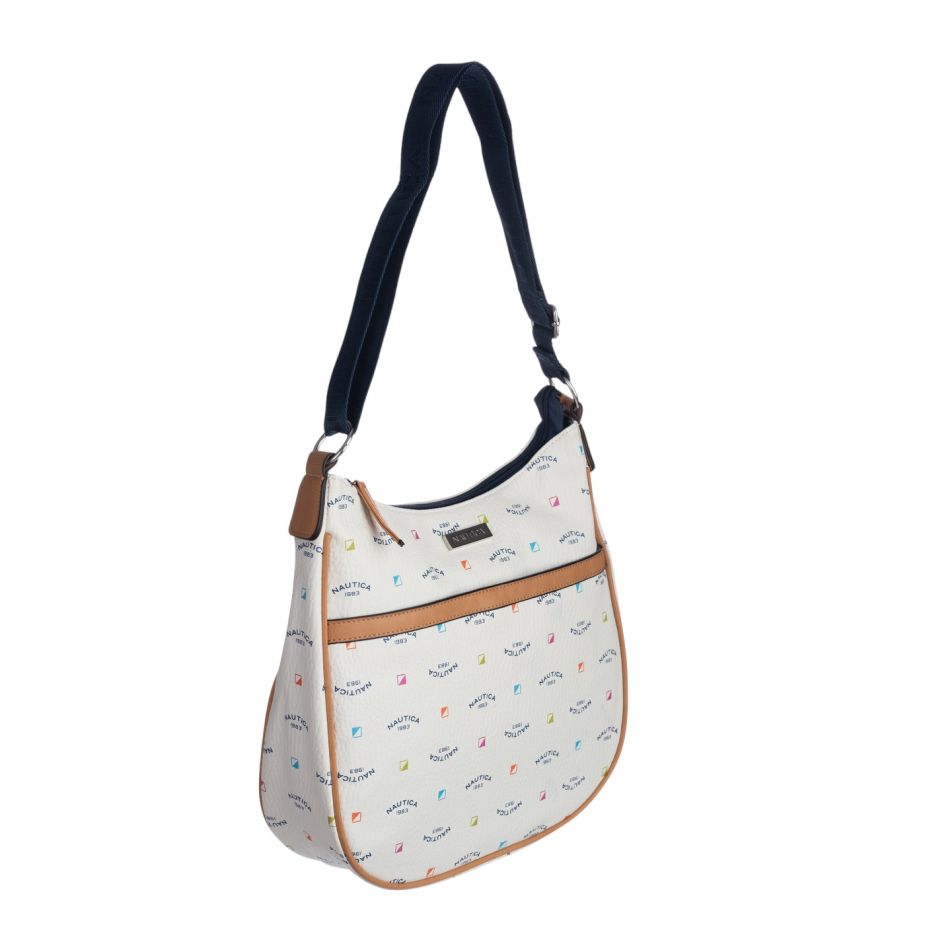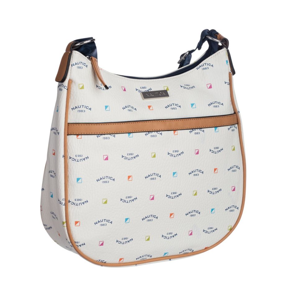 Bolso de dama; color blanco; marca nautica: este bolso hobo presenta un diseño moderno y casual, confeccionado en 100% poliuretano. su exterior destaca por un estampado multicolor con íconos cuadrados y el texto "nautica 1983", aportando un estilo juvenil y dinámico.En la parte frontal, cuenta con un bolsillo amplio de acceso rápido con cierre magnético, mientras que en la parte trasera incluye un bolsillo pequeño con cremallera para objetos de valor. el compartimento principal, también con cierre, ofrece funcionalidad y orden con un bolsillo interno con cremallera y dos bolsillos abiertos para el celular o cosméticos. con una correa resistente y herrajes metálicos, es una opción versátil y práctica para el uso diario.