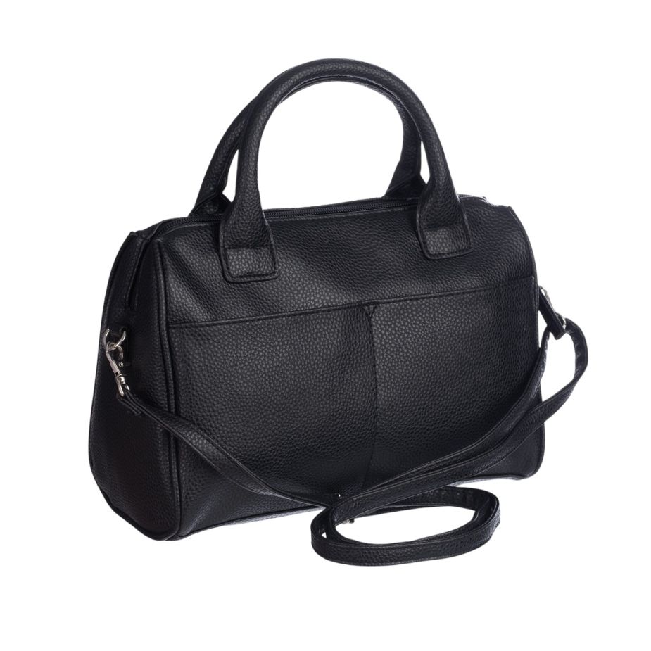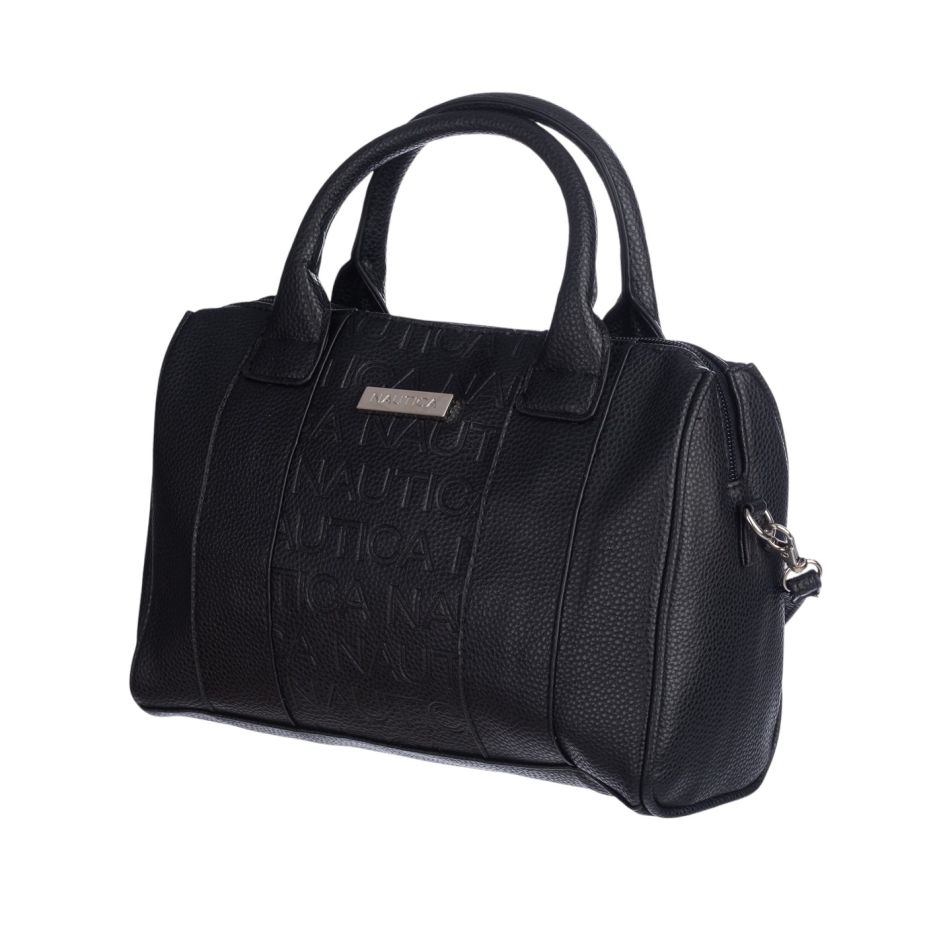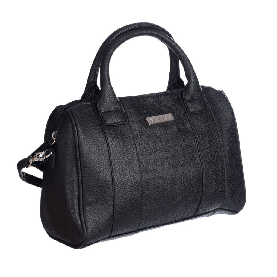 Cartera satchel; color negro; marca nautica: esta cartera combina elegancia, funcionalidad y diseño contemporáneo. confeccionada en 100% poliuretano de color negro, destaca por su estructura firme y el nombre de la marca grabado en relieve , cuenta con dos asas cortas reforzadas y una correa removible ajustable para usar al hombro o cruzada. en el exterior trasero, incluye dos bolsillos de fácil acceso para el celular o llaves. su interior, con forro de tela y cierre de cremallera metálica, ofrece un espacio amplio con un bolsillo interno de seguridad. Los herrajes plateados y su base semirrígida completan este accesorio versátil, ideal para el uso diario o eventos formales.